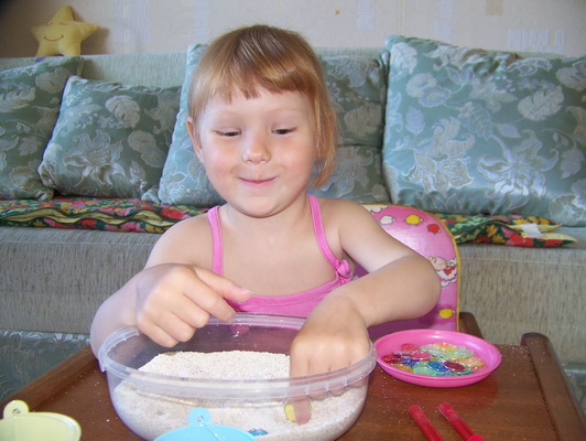 Задание состояло из 2-х этапов. Сначала нужно было найти все кружки в миске с крупой с помощью магнита. Вот радости то у ребенка было!!!
