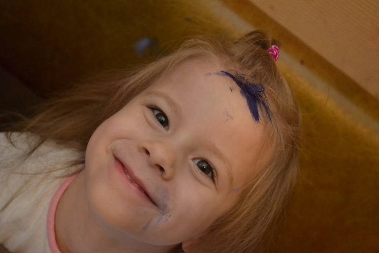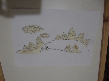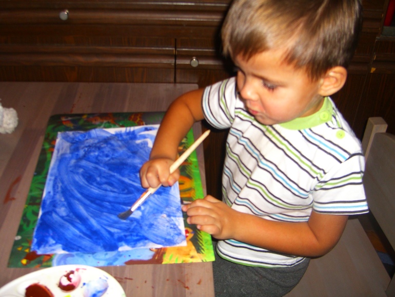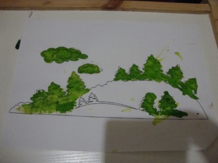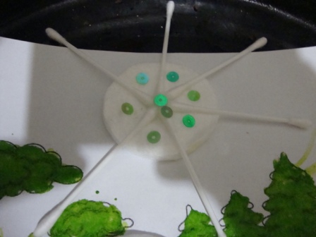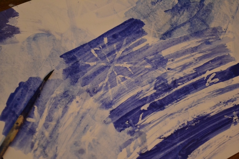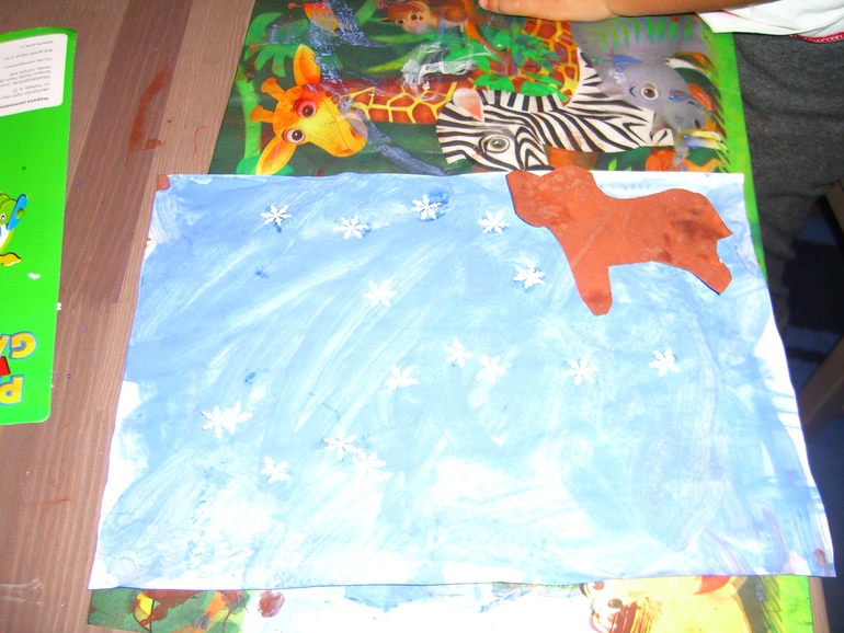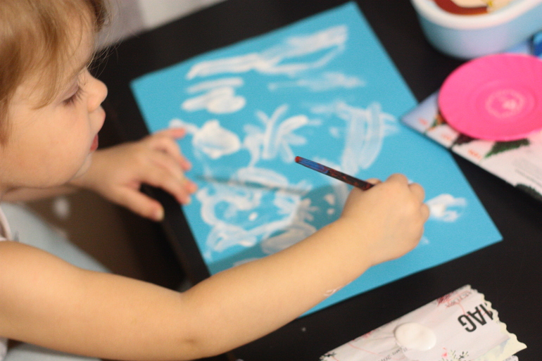 Красила пищевым красителем и синего не оказалось как на зло! Думала и справить картину снеговиком, но он у нас тоже летний получился)
