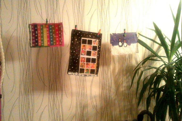 Сделали им домик - обклеили коробку из-под торта ватой. Тоже были попытки разукрашивания.