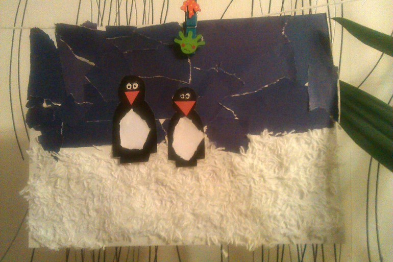 Очередная совместная работа - предновогодняя поделка украсила нашу гирлянду. Делили мы ее вот так:1) Цветную бумагу изорвали на кусочки;2) Изрезали мелко белую пряжу;3) Картон намазали клеем, сверху приклеили куски бумаги, снизу кусочки пряжи;4) А пингвины из картона ...гуляют по нашему пушистому снегу)