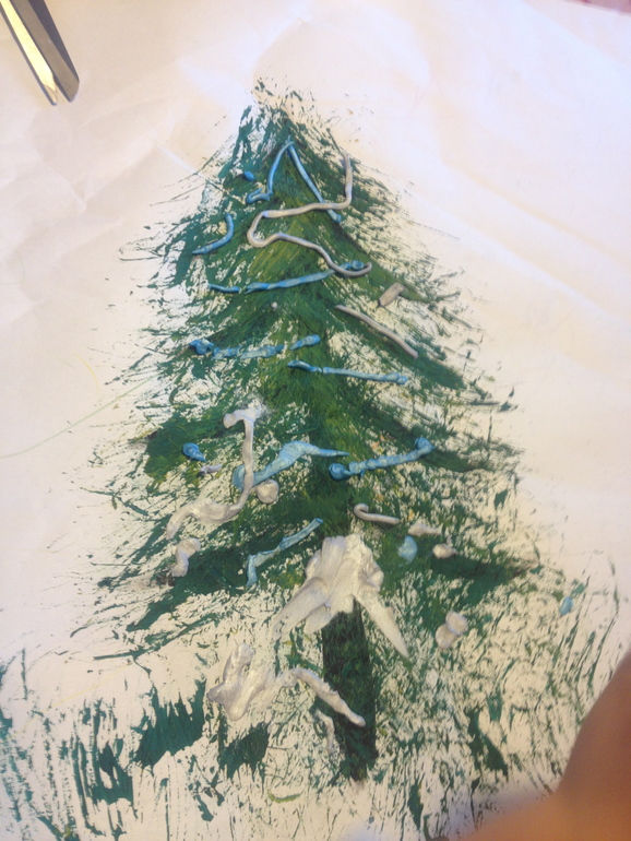 а мы рисовали еловыми палочками, иголочками ))) Форму елки я корректировала )но вообще рисовать иголочками весело - очень оригинальные рисуночки.