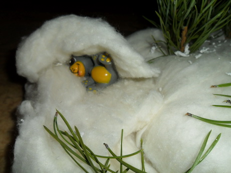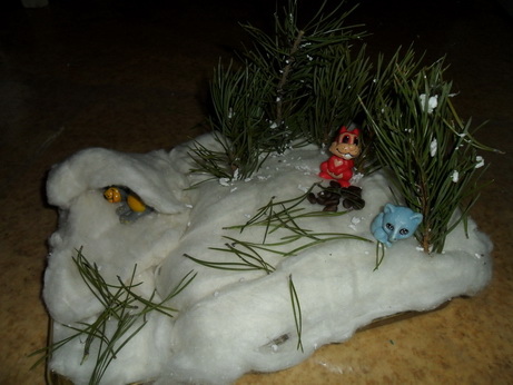 В садике на выставке Ксюша увидела композицию - дед мороз и медвежонок в берлоге спит, и дочка захотела тоже сделать берлогу для медвежонка. Дома нашли медвежонка (и других животных) и сделали для них зимний лес.
