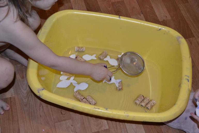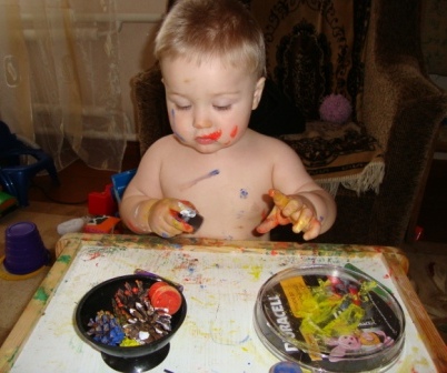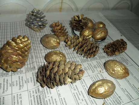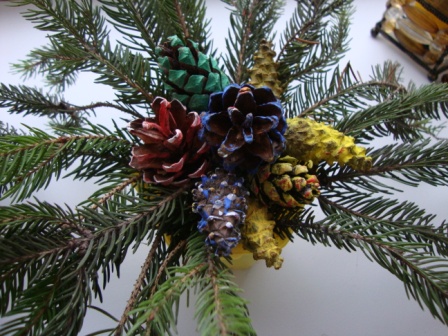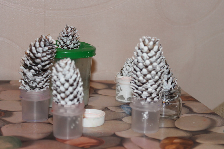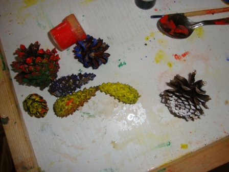 19.12. мы подсмотрели идею красить шишки и решили заняться тем же) Ооочень понравилось вазюкать грязными пальцами по шишкам. В начале я пыталась заставить красить тщательно, но потом увидела "изюменку" в не полностью окрашеных шишках)