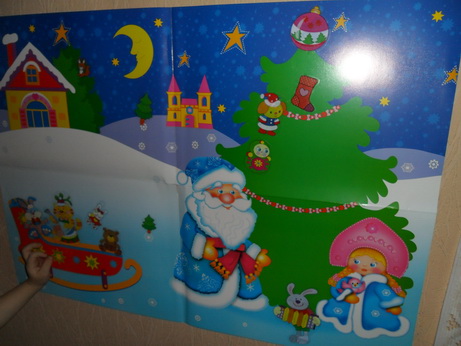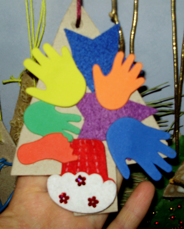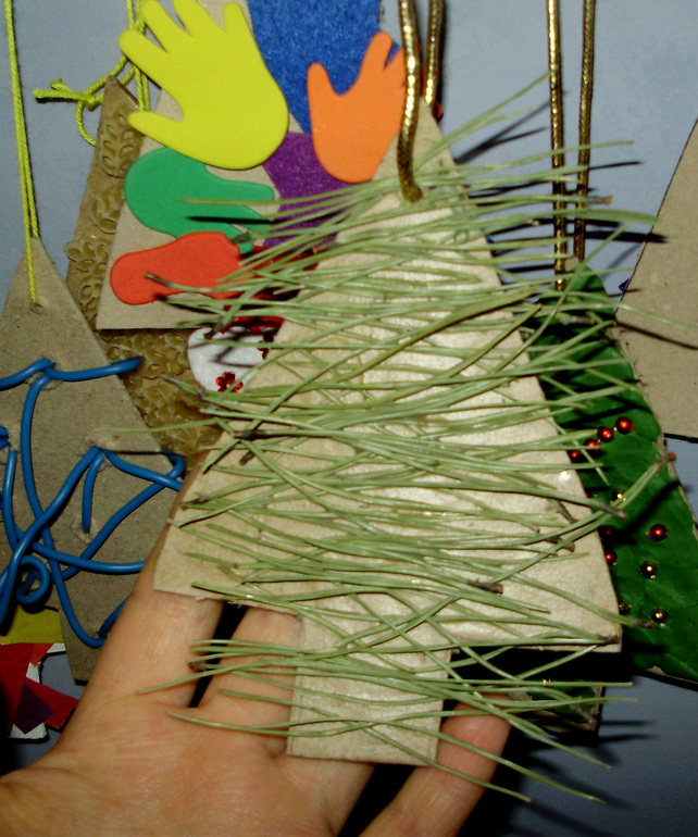Наши елочки. 19 - выдался тяжелым, очень занятым днем. Спонтанно, перед сном придумалась идея для елки (нашлись за комодом наклейки из пенки и войлока). Елка - самостоятельная Ванина работа. Я лишь одну наклеечку от его руки оторвала и помогла выбрать правильную сторону, ну и дырку пробила.