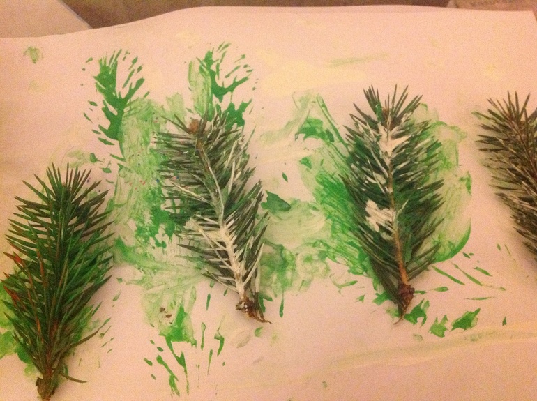 В рамках музыкально- танцевального занятия по альбому Чайковского рисовали елочками, а потом их прикоеели и покрасила белой краской- снежком