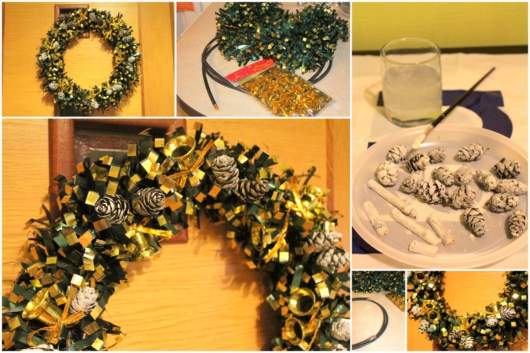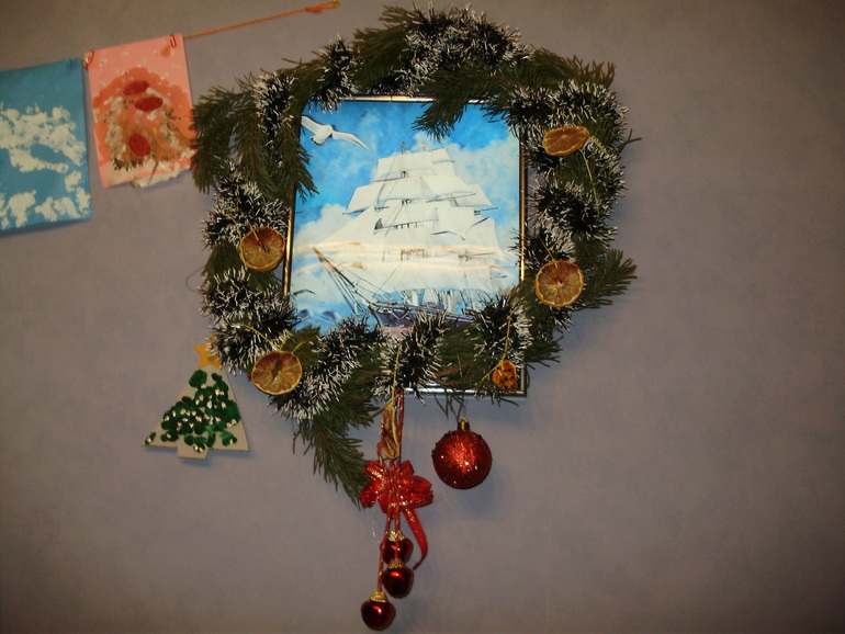 Венок с двумя "самоукрашенными" шарами. один оказался бьющимся. Поэтому уже без него.