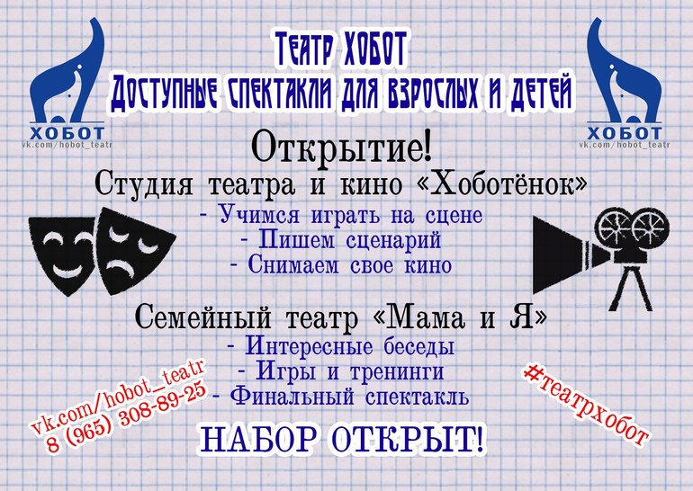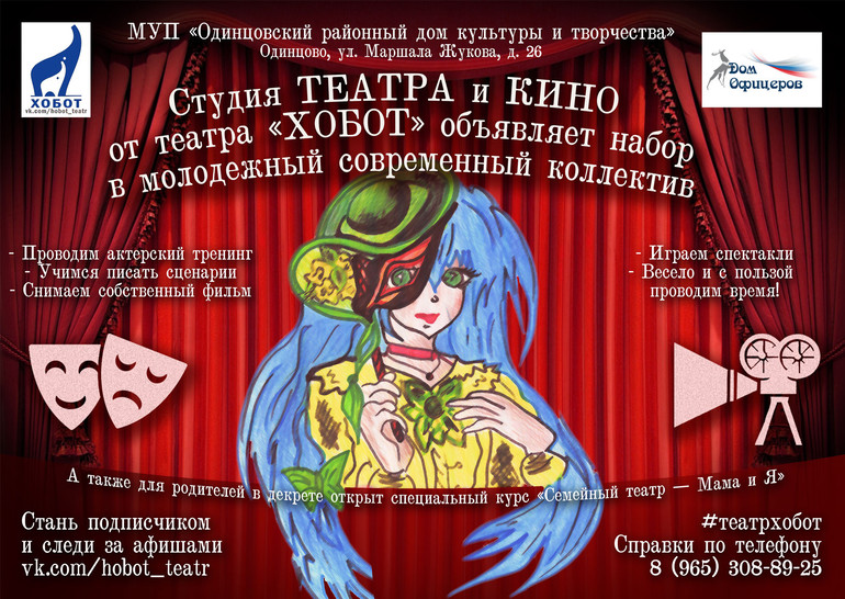 Театр ХОБОТ - Изначально взрослых коллектив, который играет комедийные спектакли и ставит развлекательные шоу. Победитель премии губернатора 2015 в номинации творческое подмосковье - 2 место! Действует и в настоящий момент. Инфу,фото и видео можно посмотреть в группе vk Только там новые афиши и вся информация о театре. Добавляйтесь, всегда рады новым подписчикам. Очень скоро новые спектакли для детей и взрослых, в т.ч бесплатные. vk.com/hobot_teatr А что касается детской студии кино и театра - Вот сайт с расписанием и ценами (так же в группе vk вы найдёте всю туже инфу) Занятия от 375 руб http://violini8.wixsite.com/hobot