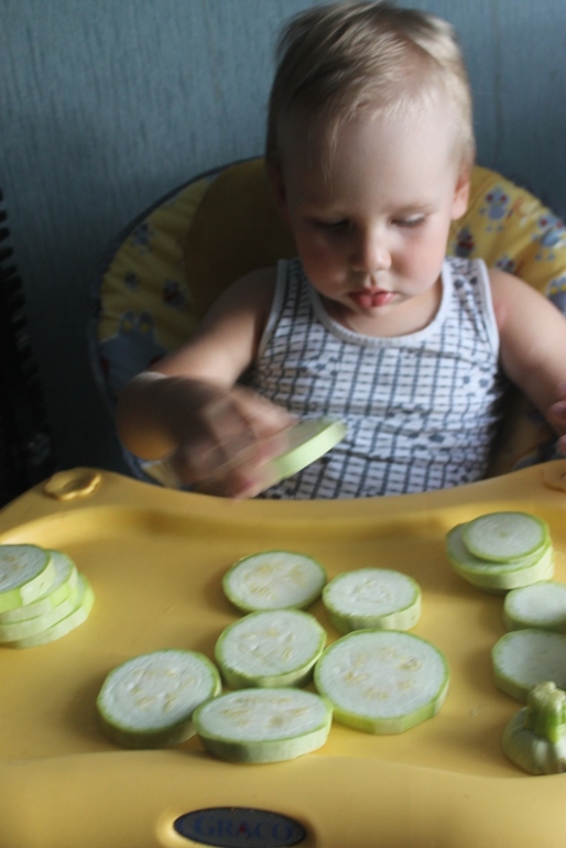 Попробовали вырезать цветочки специальной формочкой для яблок. Это тоже Артёма увлекло надолго. Практически все кружочки превратил в "цветы".