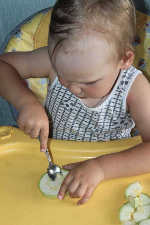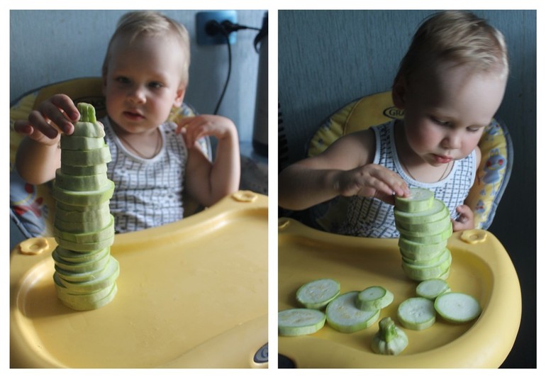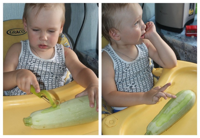 Дома мы приступили к готовке. Для начала рассмотрели кабачок. Потрогали его. Попробовали почистить с него кожуру, потрогали, какой кабачок под кожурой.