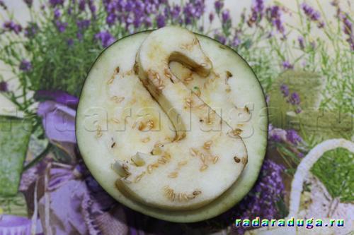 Готовили лодочки "Эмоции". Разрезали вдоль баклажаны, удалили мякоть ложечкой.