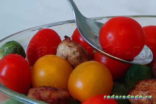 Дельфины из баклажанов c разноцветными мячиками (запеченные помидорки черри, отварная брюссельская капуста, фрикадельки из рыбного фарша), для взрослых к этому блюду можно приготовить ваш любимый соус.