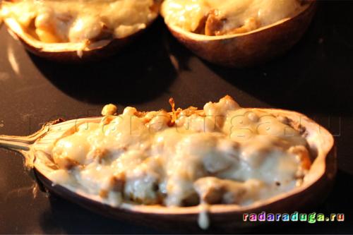 Приготовили начинку. Она может быть любой. Я потушила морковь, мелко нарезанную мякоть баклажана и цветную купусту. Выложили начинку в лодочки, посыпали сыром (наше любимое занятие!) и в духовку.