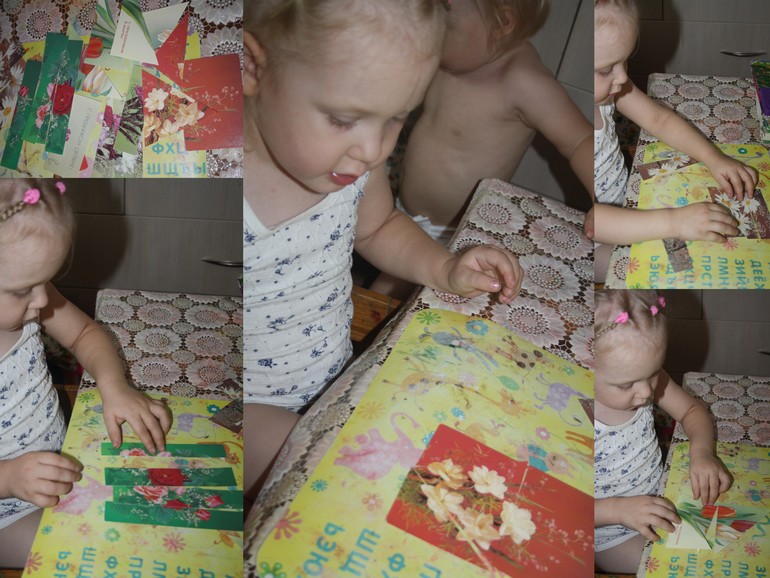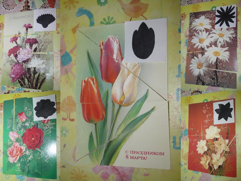 1. Собрали разрезные картинки (старые открытки) и подобрали к каждому цветку тень.