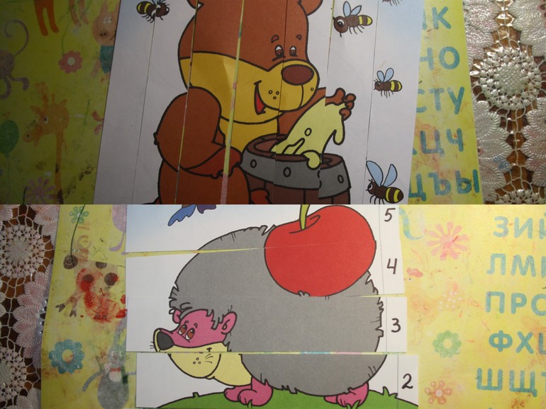 8. Собрали разрезные картинки (из раскрасок): медведь и еж.