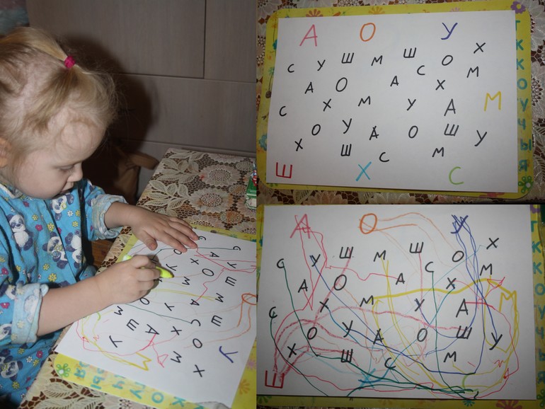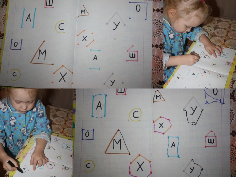 1. Соединили большие цветные буквы с маленькими соответствующим цветом. Трудно разобрать что-то в конечном варианте, но буквы отыскались все.