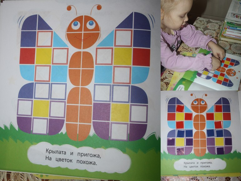 10. Приклеили недостающие квадратики на бабочку ("Подумай и наклей. Цвет. Развивающие наклейки").