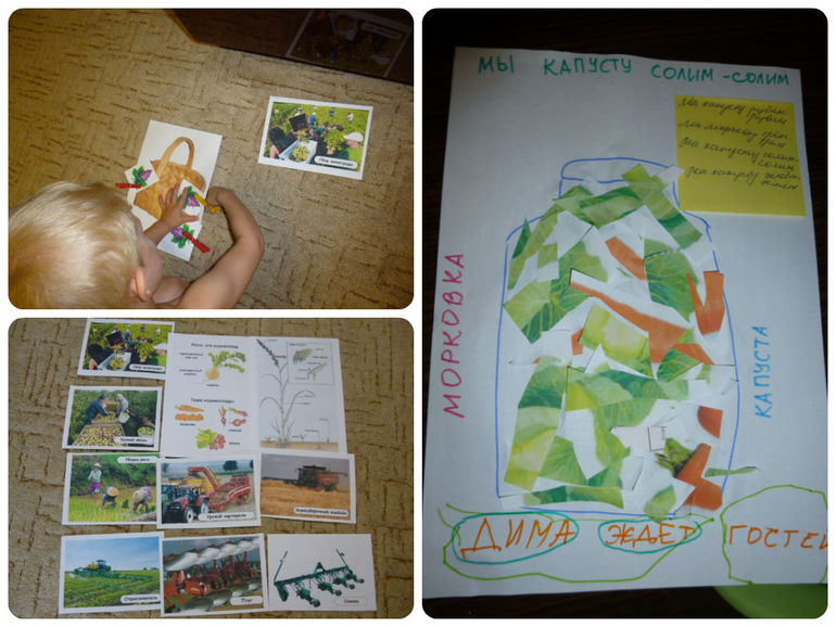 После сна Димку ждали карточки с разной техникой и уборкой урожая (яблок, пшеницы, риса, картофеля и винограда). Он хоть и проснулся не в духе, но на картинки внимание обратил. Я как могла весело порассказывала про сбор того или иного урожая. Показывала как картошечку ручками собирают (несмотря на то, что есть картофелеуборочные комбайны). Понагибалась, даже Дима присоединился.