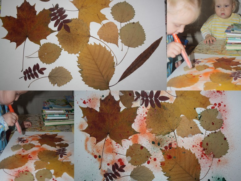 11. Аппликация из листьев и воздушные фломастеры (сначала хотела листья убрать, после того как набрызгаем фломастерами, а потом показалось, что так намного лучше будет и оставили все как есть).