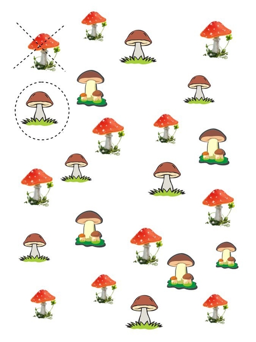 С этой же копии было изготовлено ещё задания. " Найди лишнее" ( На полоску бумаги наклеены 3 мухомора и белый; 3 белых с тремя грибами и одиночный гриб;, ....)