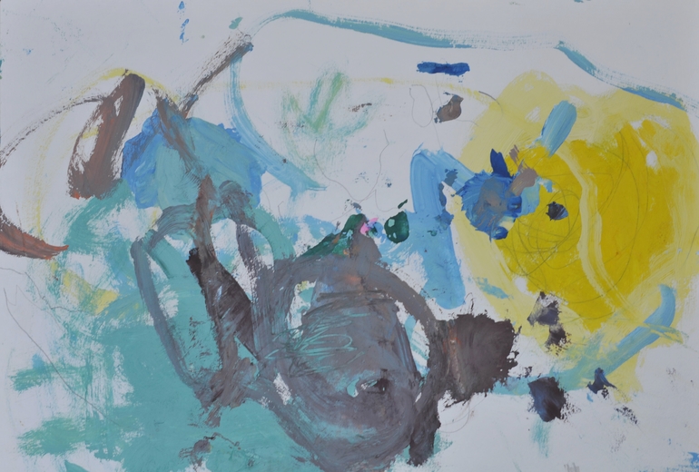 Никита рисует солнце (хорошо видно справа на рисунке в начале поста). Преподаватель:"А теперь начнем раскрашивать. Желтой краской нарисуем звезды." Никита: " Я буду раскрашивать мое солнце." Раскрашивает, терпеливо, но кисточку правильно держать отказывается, после двух попыток перестаю поправлять - сижу рядом, наблюдаю. Преполаватель:"Теперь на палитре смешаем желтый и белый (помагаю достать и открыть нужные баночки, Никита радостно смешивает), получился более светлый оттенок желтого, обведем им контуры наших звезд (Никита обводит свое солнце)." Дальше преподаватель предлагал закрашивать небо синим, голубым и фиолетовым, а потом черным силуэт замка. Но Никита уже весь погрузился в смешивание цветов на палитре, просил меня помочь выложить из баночек все новую и новую гуашь и смешивал. Я помогала, преподаватель понимающе улыбался, так мы и просидели до конца занятия. На мои робкие просьбы, нарисовать что-нибудь получившимися после смешения волшебными красками, Никита нехотя накалякал несколько пятен слева и в центре. Потом стал по ним катать кисточку, то есть фактически деревянную ручку как валик перекатывал, а потом еще обратной стороной кисточки немного поцарапал и под темной краской проступила светлая. Я не мешала самовыражению, следила толкьо. чтобы баночки с краской на пол не упали. Но почему-то под конец занятия мне ужасно стало обидно, так что слезы подступили.