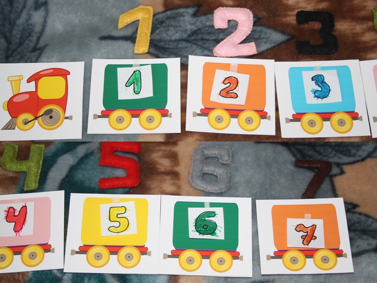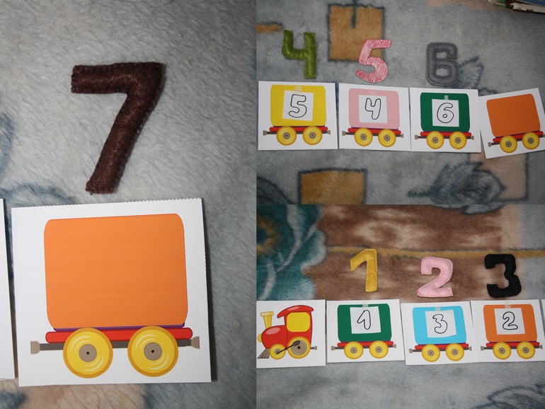 1. Цифры решили отвезти своих детишек на прогулку, но пока все собирались, малыши перепутались -- Катюша помогла расставить вагончики с малышами возле своих мам. А тут как раз подоспела и новая цифра -- 7, но она не нашла своего малыша.