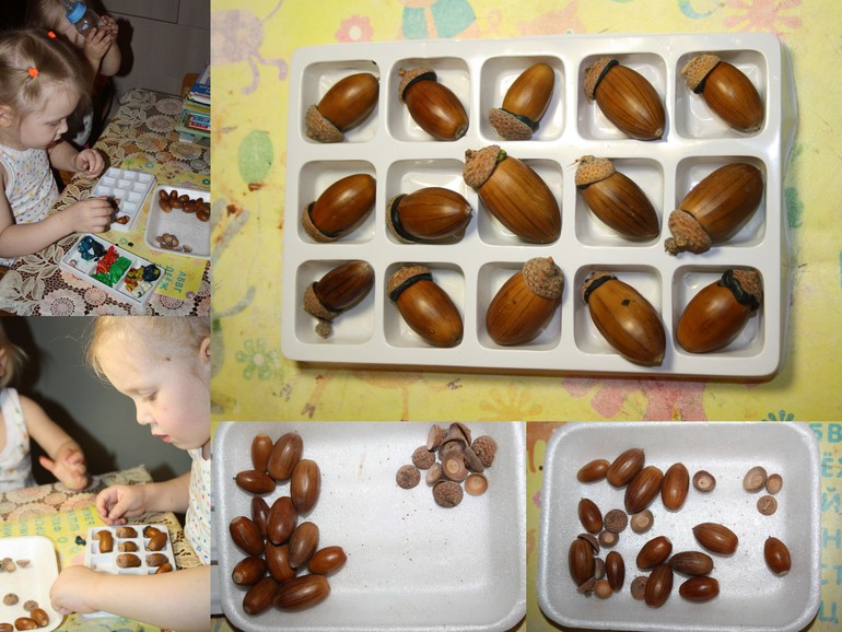 Приклеили желуди к шляпкам с помощью пластилина и разложили по ячейкам.