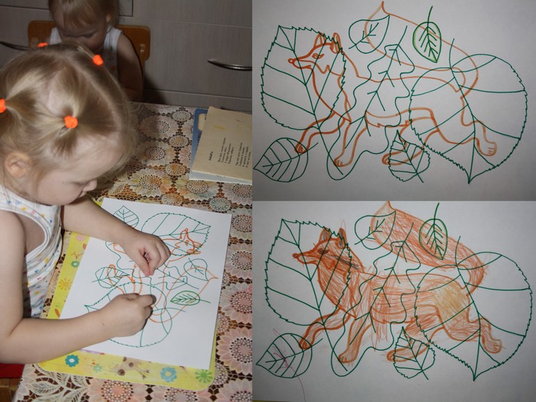 4. Отгадали, кто спрятался в листьях. Помогли зайцу увидеть лису - раскрасили ее.