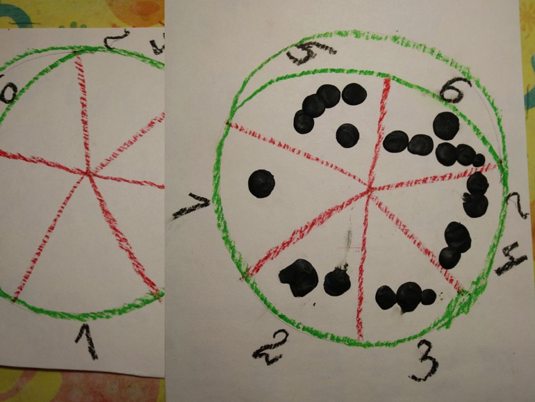 5. Ослик и свинка очень любили арбуз. Приклеили семечки (пластилин) на дольки арбуза.