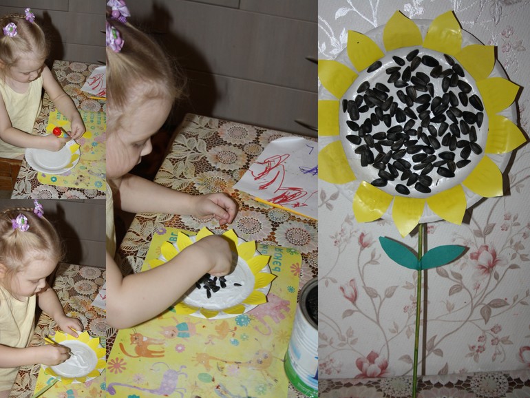10. Сделали цветок подсолнуха (бумажная тарелка, клей, цветная бумага, шпажка, семечки). Уж очень ослик любил греться на солнышке.