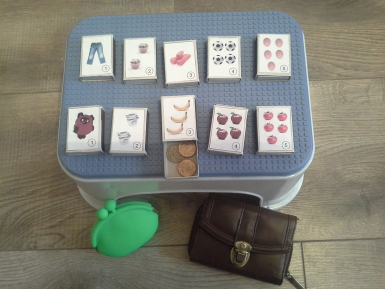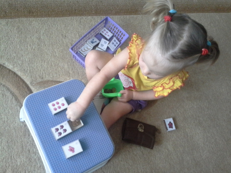 Считаю игру достаточно удачной. Здесь и количество, и цифры, и даже некое представление о кассе)) Ульяна отсчитывает нужное количество монет (предварительно я их мою), складывает в коробок и кладет купленный товар в корзину. И да, кошельков у Ульяны много)![]()