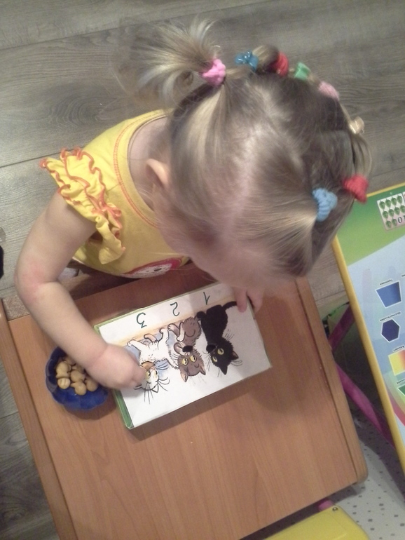 Для начала же важнее научить ребенка узнавать количество. Отличная тренировка - игра «больше-меньше». Я высыпаю перед Ульяной 2 кучки фасоли/макарон/бусин/орехов или другой мелочи…в одной кучке 2-3 штучки,в другой - много. В главных ролях у нас фигурки Маши и Медведя. Медведь любит кушать МНОГО, Маша - МАЛО. Постепенно делаем кучки примерно одинаковыми, усложняя задачу…