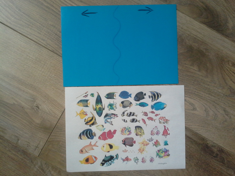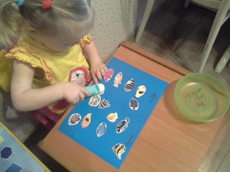 Задача ребенка - наклеить рыбок на правую и левую половинку листа в соответствии с направлением, куда рыбка плывет.![]()