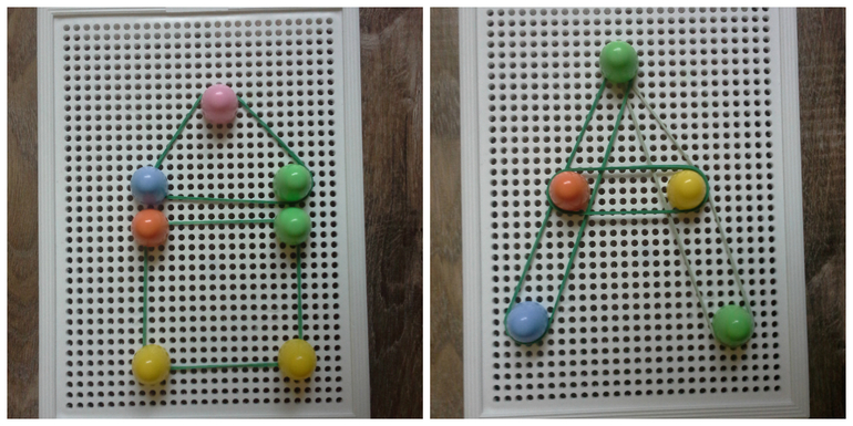 4. Играем в геометрик, сделанный из мозаики. Планировала сделать, как делают большинство, на доске и из кнопок, но пока у нас этот вариант-«минутка». Играем с канцелярскими резинками.![]()