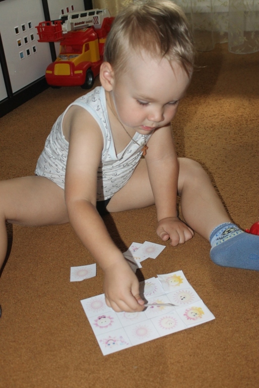 Сделала для Артёма лото из солнышек. Солнышки между собой очень похожи, поэтому приходилось смотреть очень внимательно. Солнышки брала здесь.