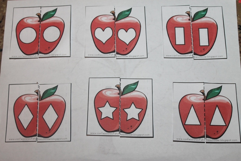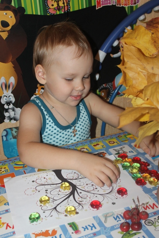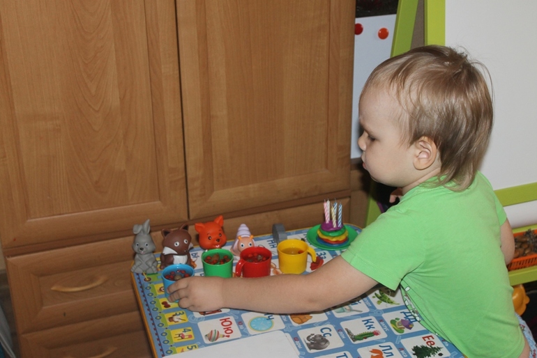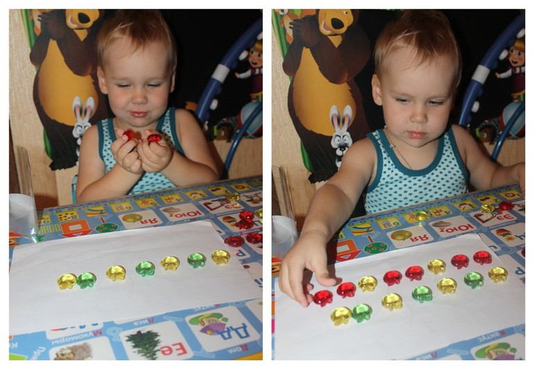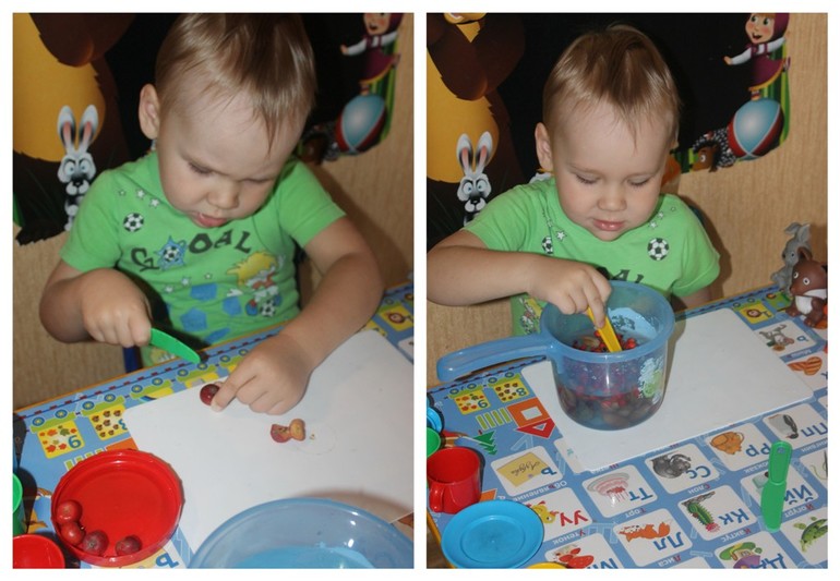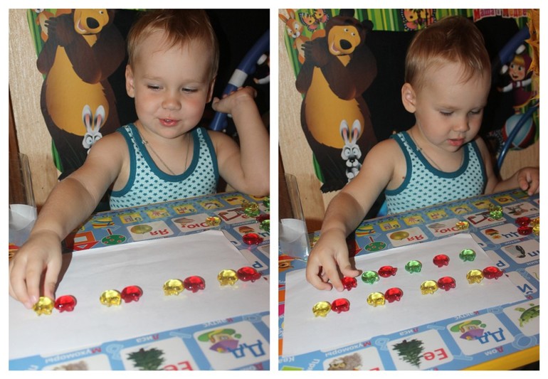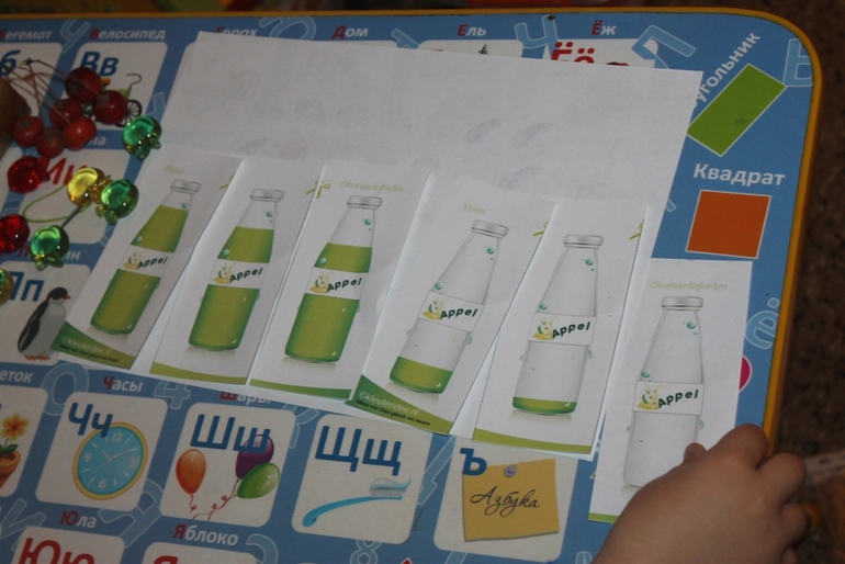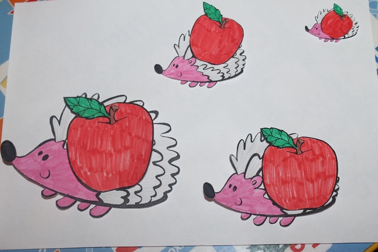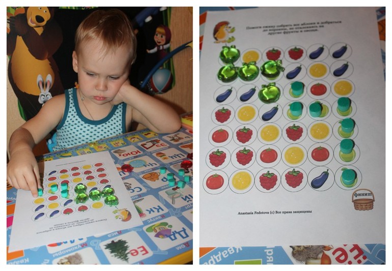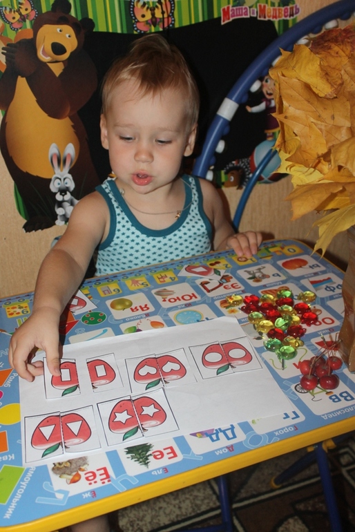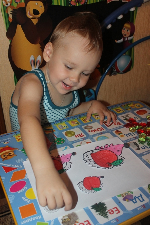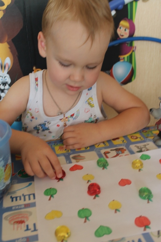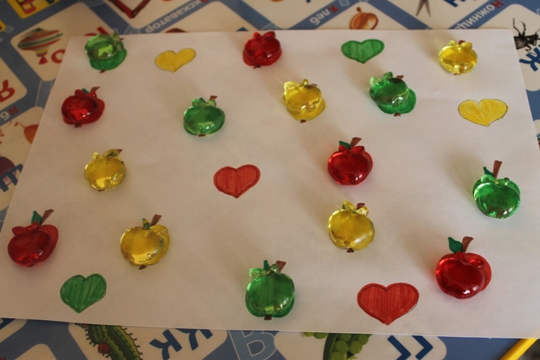 Потом я добавила в него яблочки. И попросила Артёма найти их и разложить по своим домикам. Но, немного схитрила, помимо яблочек нарисовала на листочке ещё и сердечки очень похожие на яблочки. Но Артём не поддался. всё сделал правильно.