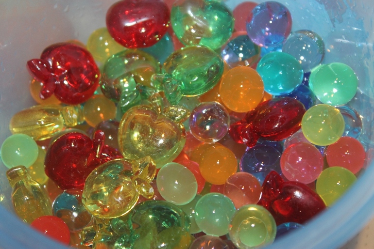 Начали мы с сенсорной коробки из гидрогеля. Как же долго Артём с ней играл. И на следующий день играл, и через 2 дня играл. И через 3 дня играл. Играл и играл, так ему нравилось. Играл до тех пор, пока весь гидрогель до конца не разломался и я его не выбросила.