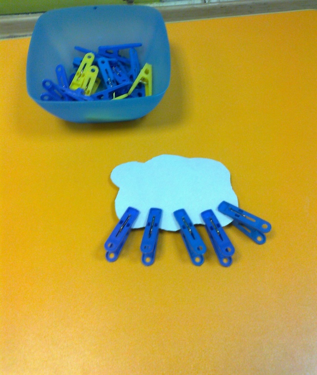 Сравнили овечку с облачком (белое и пушистое) Сделали дождик из прищепок)