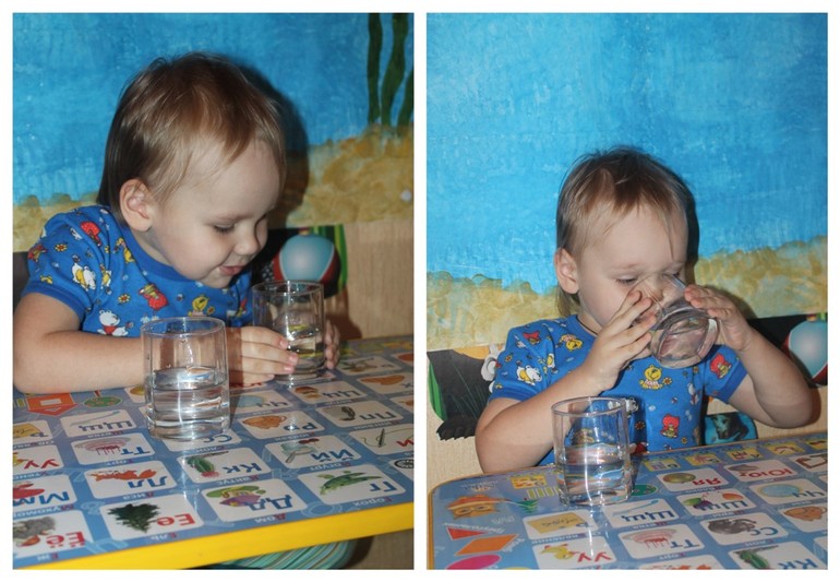 Вспомнили какая солёная на море вода. Провели небольшой опыт. Взяли два стакана - в один налили пресную воду, а в другой подсоленную. Артём сразу определил на вкус в каком стакане солёная водичка.