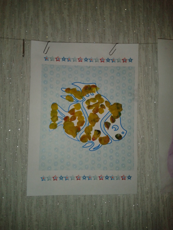 Посмотрели книжку "Сказка о рыбаке и рыбке" и сделали золотой рыбке чешую из пластилина.