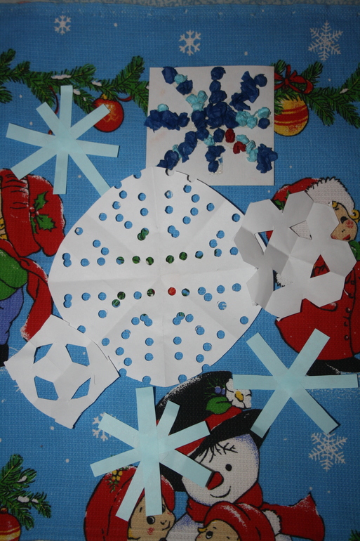 В эти дни мы вырезали снежинки, клеили снежинки, дыроколили снежинки и рисовали снежинки, клеили из комочков бумаги. Окна мы тоже украсили снежинками (отпечатками с помощью зубной пасты) - только фото не получаются.