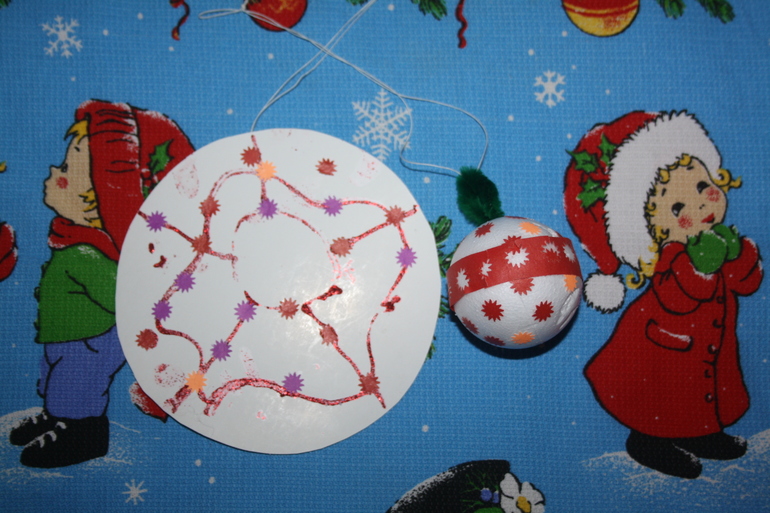 Украшали новогодние шары: один был вырезан из бумаги, а второй покупной из пенопласта.