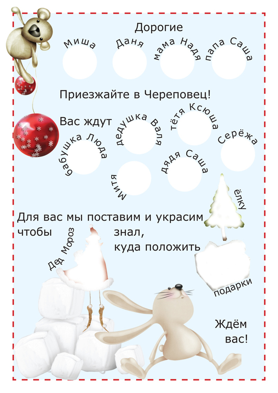 Есть у меня сестричка, у нее двое сыновей. Живут они в Питере, и каждый Новый год мы ждем их в гости. В этом году решила выслать приглашение племянникам. Приглашение придет им по обыкновенной почте (для них будет экзотикой). Старший племяш уже немножко умеет читать, но чтобы и младшему было интересно, добавила простеньких картинок. К созданию шедевра привлекла своего Сережу.