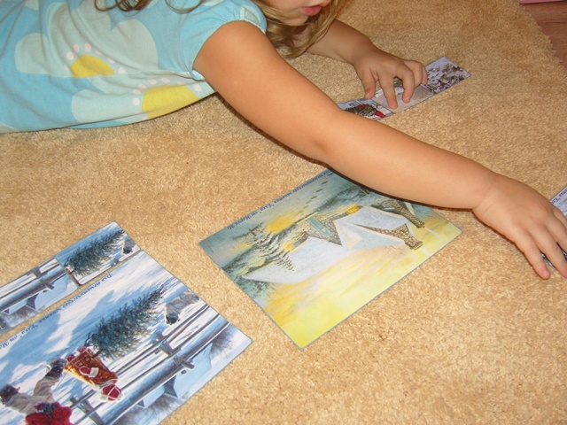 А затем дочка снова разрезала на карточки и подбирала уже элемент картины и укладывала его на то место где он должен быть!