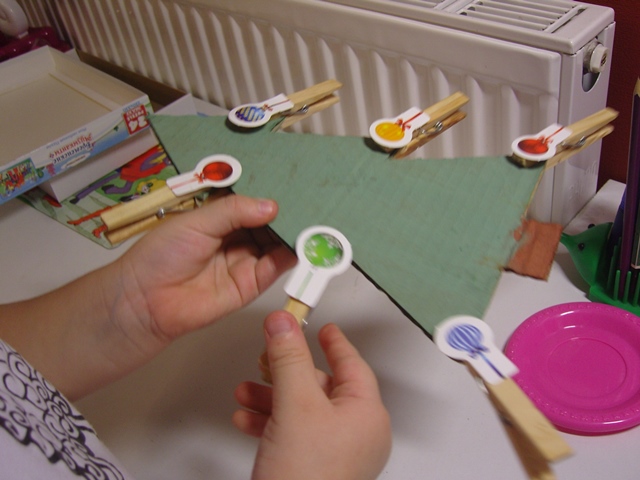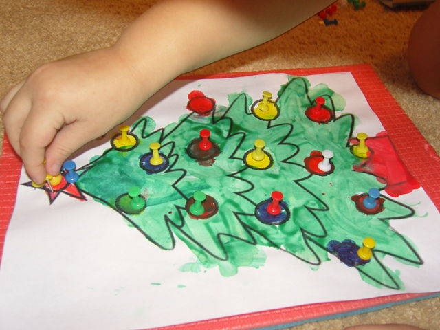 Сделали елку (я подготовила картонные заготовки), дочка с папой разукрасили и Эльвирка прикрепила шарики. Вышло очень красиво!