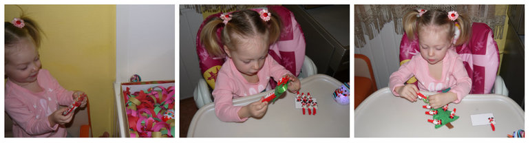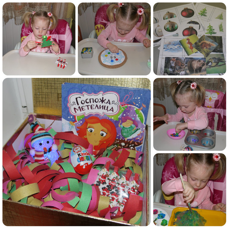 1. И в нашу новогоднюю коробочку снеговик принес нам прищепочки с Дедом морозом, которыми надо было украсить нашу елочку.