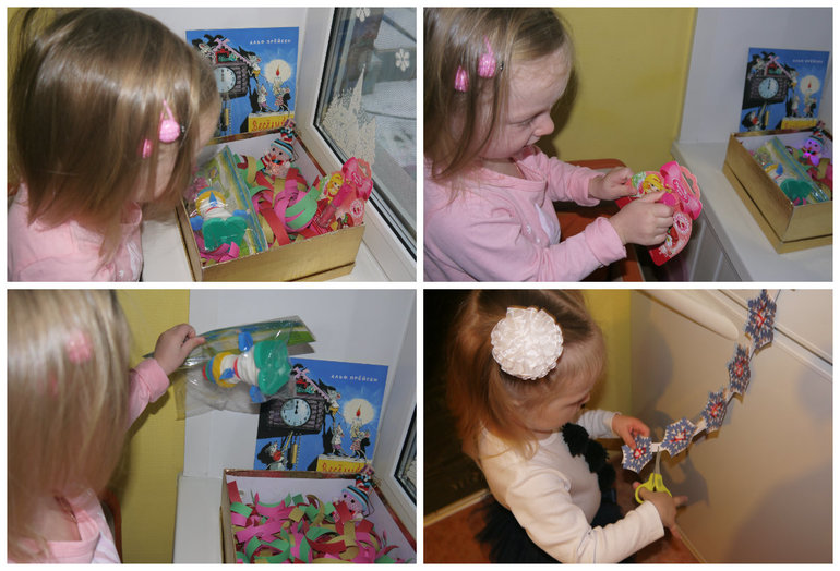 Книга (Веселый Новый год), в подарок блеск для губ, а то всегда просит накрасить ей губы, когда видит, что я крашу. Снеговик-конструктор, Лиза то его разобрала, а собрать то оказалось сложно, собирали вместе.