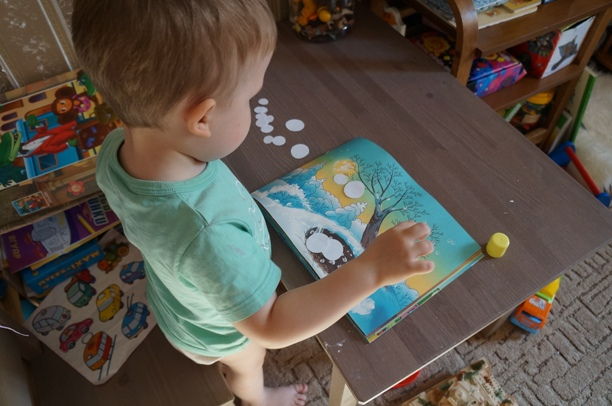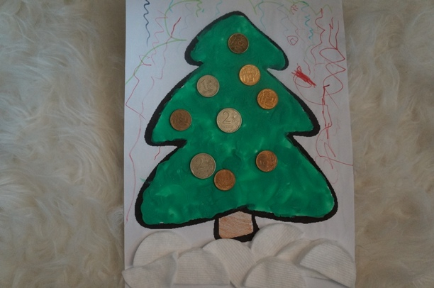 Потом Темыч сам решил прилепит на елочку монетку (мы ж с ним играем в магазин периодически, деньги под ногами валяются)) я поддержала. Потом вспомнила про ватные диски а-ля сугробы! тоже сделано! Ну, и чтоб белый фон не огорчал, а радовал - нарисовали конфетти)