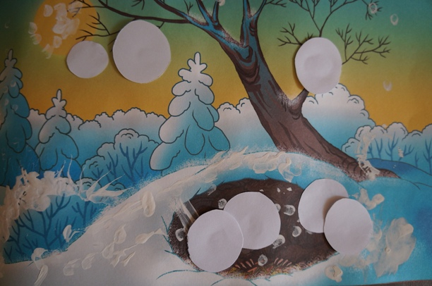Закапываем медведя в берлоге снежными шариками (приклеивали):