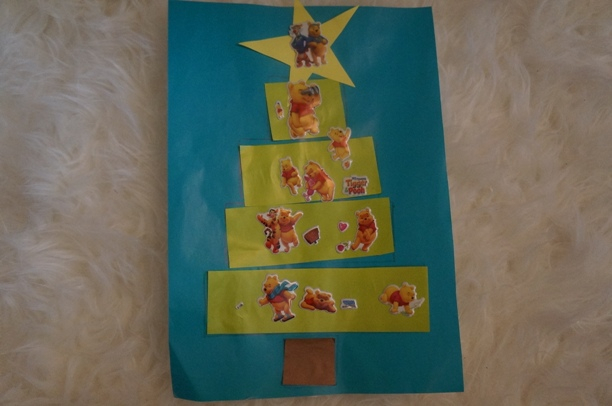 полосочки надо было разместить от большей к меньшей, а дальше полет фантазии! дала ему симпатичные наклейки с винни пухом и он уже сам украшал елочку.