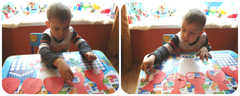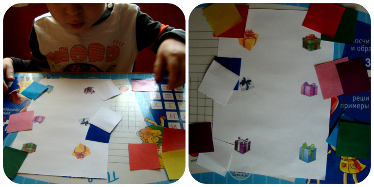 Но на этом наша помощь Деду Морозу не закончилась.. помогаем определить ему размер мешка - раскладываем размерные ряды. А так же помогаем собрать все подарки в мешок (аппликация).